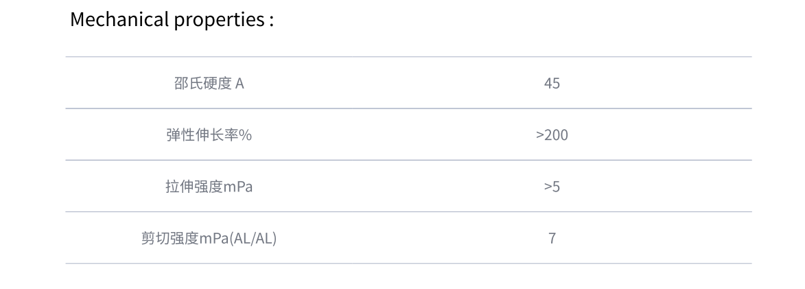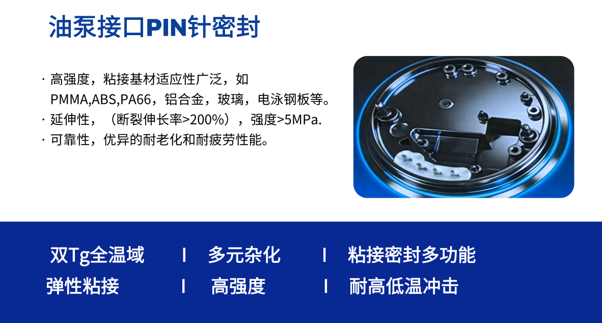 高强度,粘接基材适应性广泛,如PMMA,ABS,PA66,铝合金,玻璃,电泳钢板等。高延伸性,(断裂伸长率>200%),强度>5MPa.高可靠性,优异的耐老化和耐疲劳性能。产品具有双Tg,适用温域广。